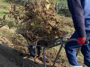 収穫した黒豆は、乾燥させるために、一輪車でガレージに運びます。