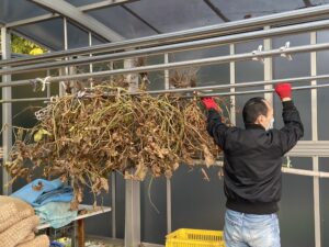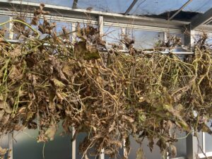 運んだ黒豆は、2本ずつ茎の根元を紐で結び、茎ごと竿に引っかけます。約2週間、風通しがよく、雨がかからないガレージで乾燥させます。乾燥が終わると黒豆の完成です。