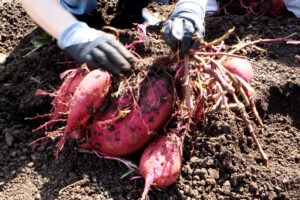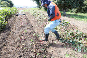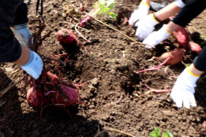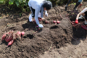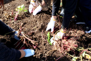 次はサツマイモ掘り。まずは土をほぐして、株のまわりを手で掘っていきます。