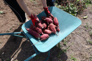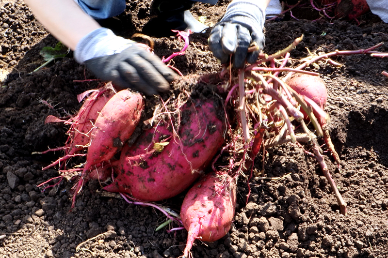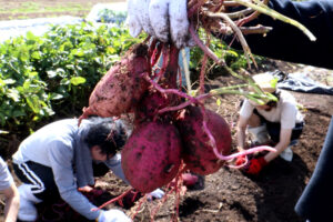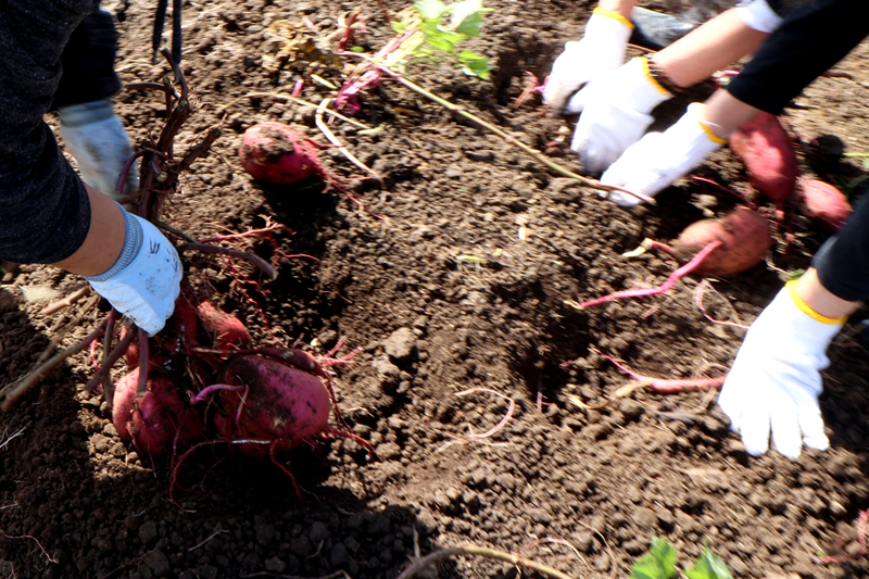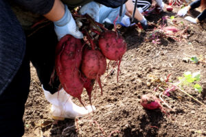 写真のものは「べにはるか」という種類だそうですが、よく見かける長い形だけでなく、丸い形や特大のものなど、自然栽培ならではいろんな形のものがとれました。他にも安納芋やシルクスイートも収穫できました。